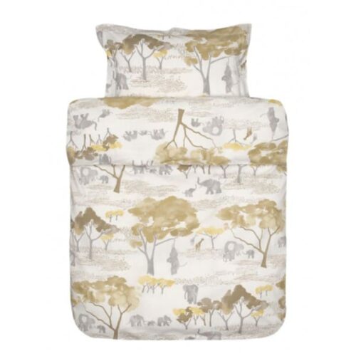 Høy | Sattao er et økologisk og bærekraftig sengesett for barn. Designet er inspirert av elefantbarnehjemmet i Nairobi, Kenya. Dette settet inkluderer et dynetrekk, et sengetøy og et putetrekk i elefanttrykk. Dynetrekket har glidelåslukking og lakenet har strikk i alle fire hjørner for sikker passform.
